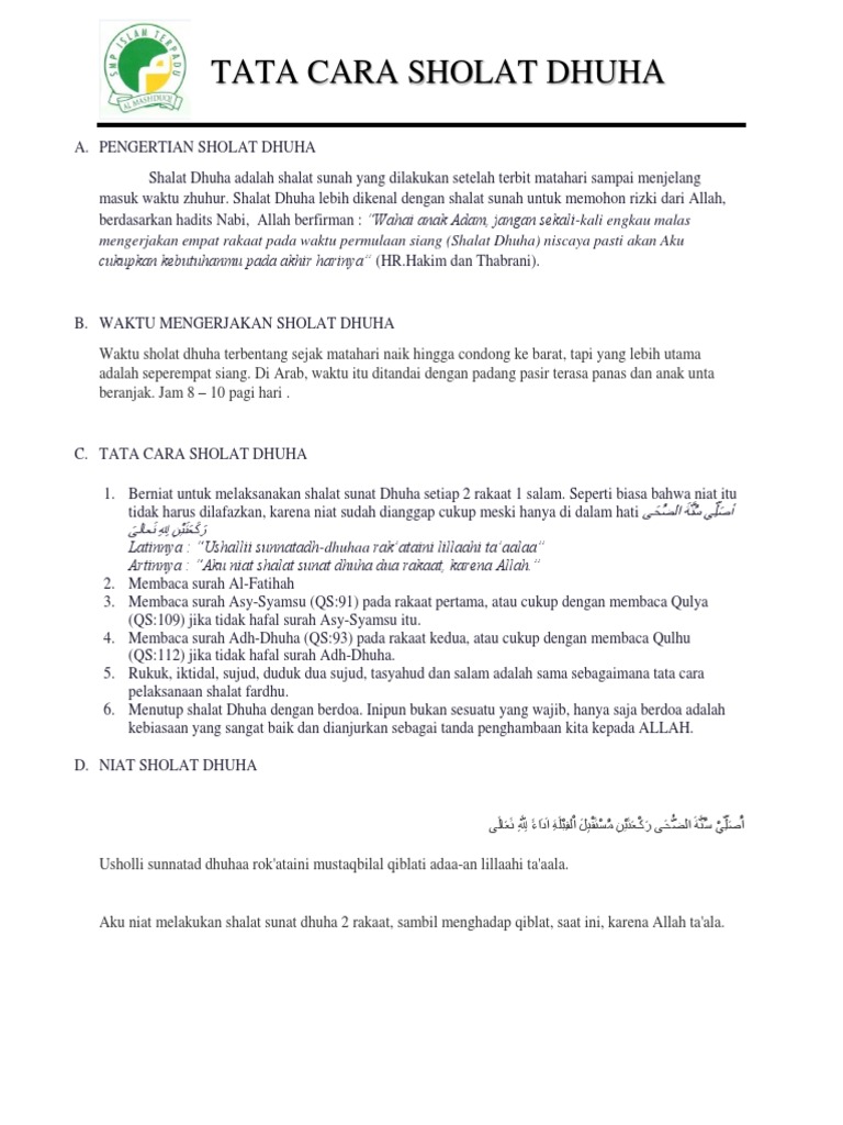 Bagi sahabat dream yang memulai untuk. Tata cara pelaksanaan sholat dhuha sama dengan tata cara sholat wajib, yang membedakan hanya pada niat karena sholat dhuha di kerjakan dengan satu salam dalam dua rakaat. Apabila ada kesulitan dalam mempraktekan sholat dhuha. Sholat dhuha juga memliki tata cara sebagaimana sholat yang lainya, untuk lebih lengkapnya bisa disimak tulisan dibawah ini.